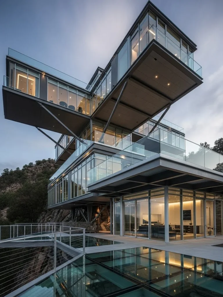 This ultra-modern mansion features floating volumes that appear to defy gravity. Glass, steel, and concrete interact to create a sculptural, futuristic silhouette. The home feels like a work of art, balancing minimalism and technological sophistication.
