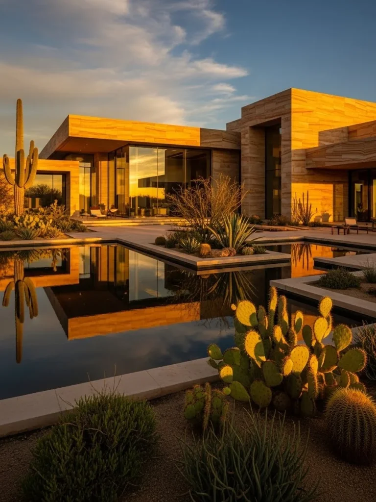 Reflecting pools are strategically placed to cool the air and mirror the sky. Their surfaces capture sunset tones, transforming the home into a glowing desert oasis. Outdoor spaces become extensions of the interior.