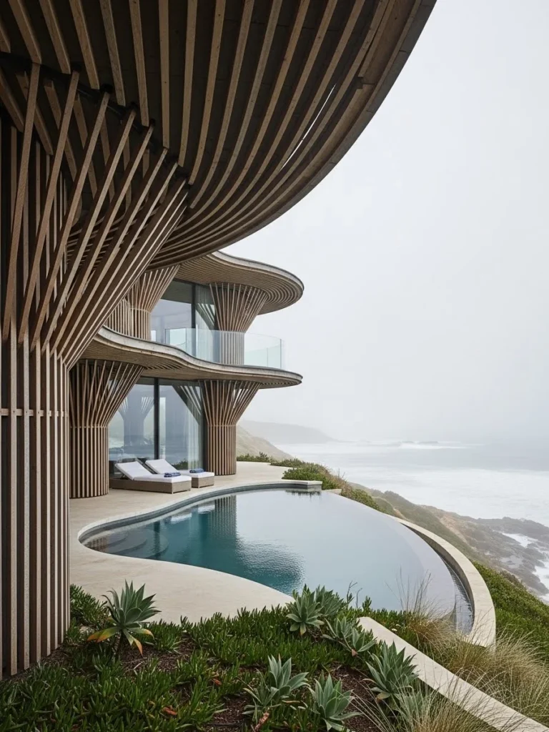 This coastal retreat is defined by flowing curves and organic architectural lines. Rather than rigid geometry, the structure embraces softness, echoing the movement of waves and wind. Natural wood slats and smooth concrete create a tactile, sculptural exterior.