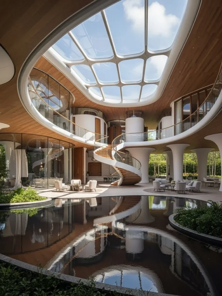 Inside, open-plan spaces follow curvilinear forms, guiding movement intuitively. Natural light sculpts interiors, highlighting materials and flowing geometry. Timber, stone, and subtle textures provide warmth and contrast to the futuristic forms.