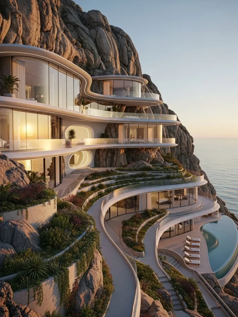Carved directly into natural rock, this futuristic luxury home feels both ancient and forward-looking. Organic forms replace straight lines, allowing the architecture to flow naturally from the stone. The home appears as a continuation of the landscape itself.
