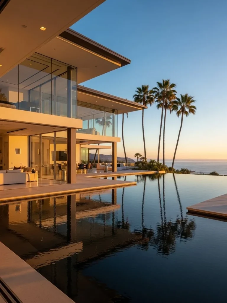 Outdoor terraces and infinity pools align with cantilevered volumes, enhancing the sensation of floating above the ground. During sunset, warm golden light interacts with glass and concrete, amplifying the home’s cinematic presence.