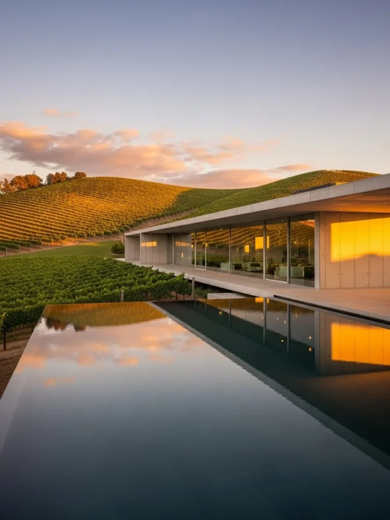 This linear modern estate stretches across a vineyard landscape, its elongated form echoing the geometry of cultivated rows. Concrete, glass, and steel create a refined yet understated presence against rolling hills. The architecture emphasizes horizontality and calm.