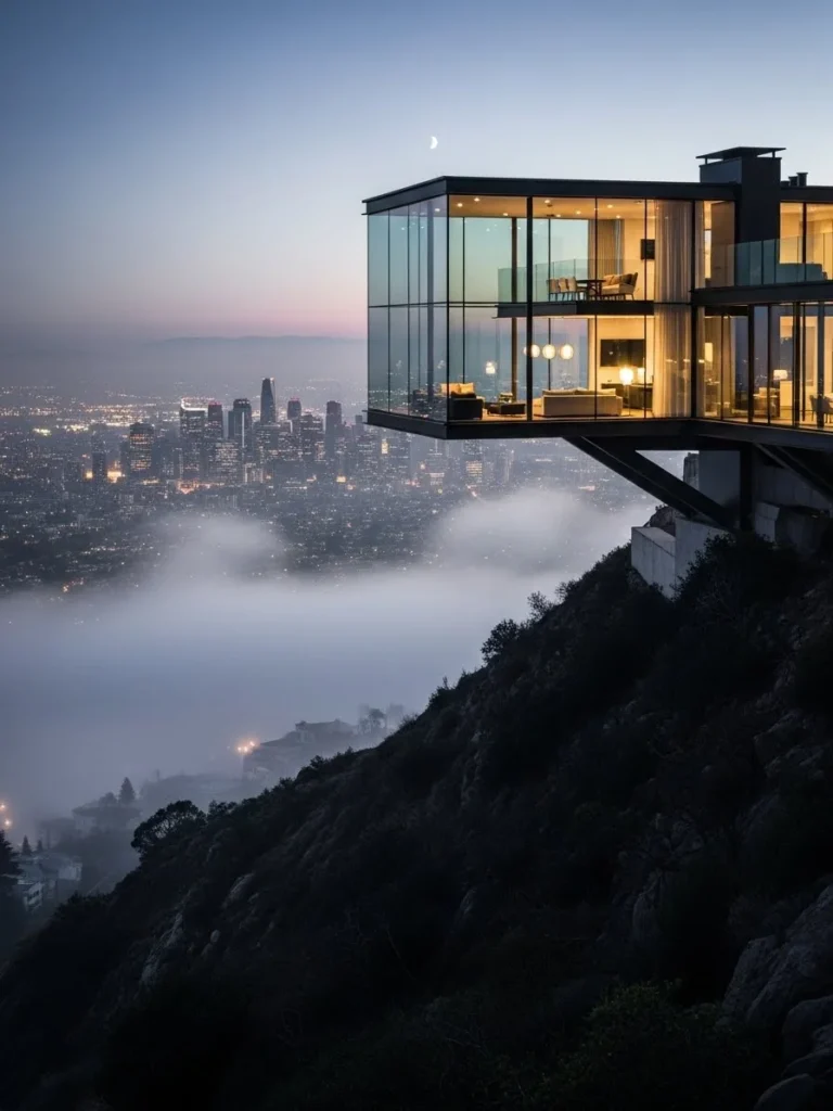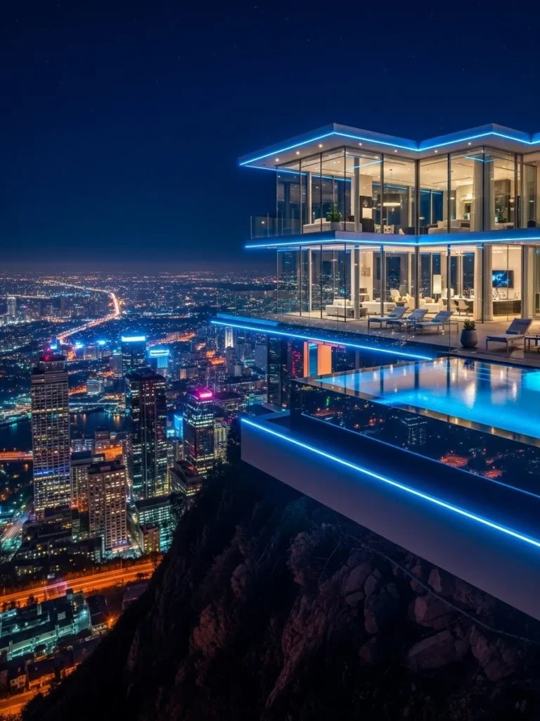 As evening falls, subtle lighting highlights architectural lines and terraces, making the residence glow like a sculptural beacon. The mansion embodies modern luxury, daring design, and harmonious integration with its dramatic natural setting.