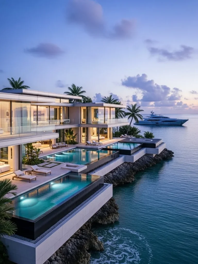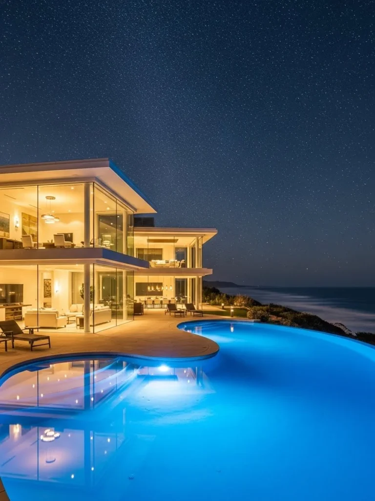 At night, subtle lighting transforms the house into a glowing sculpture. The ocean becomes a dark mirror, reflecting the villa’s refined lines. This is not just a residence, but a serene dialogue between luxury, engineering, and the endless horizon.
