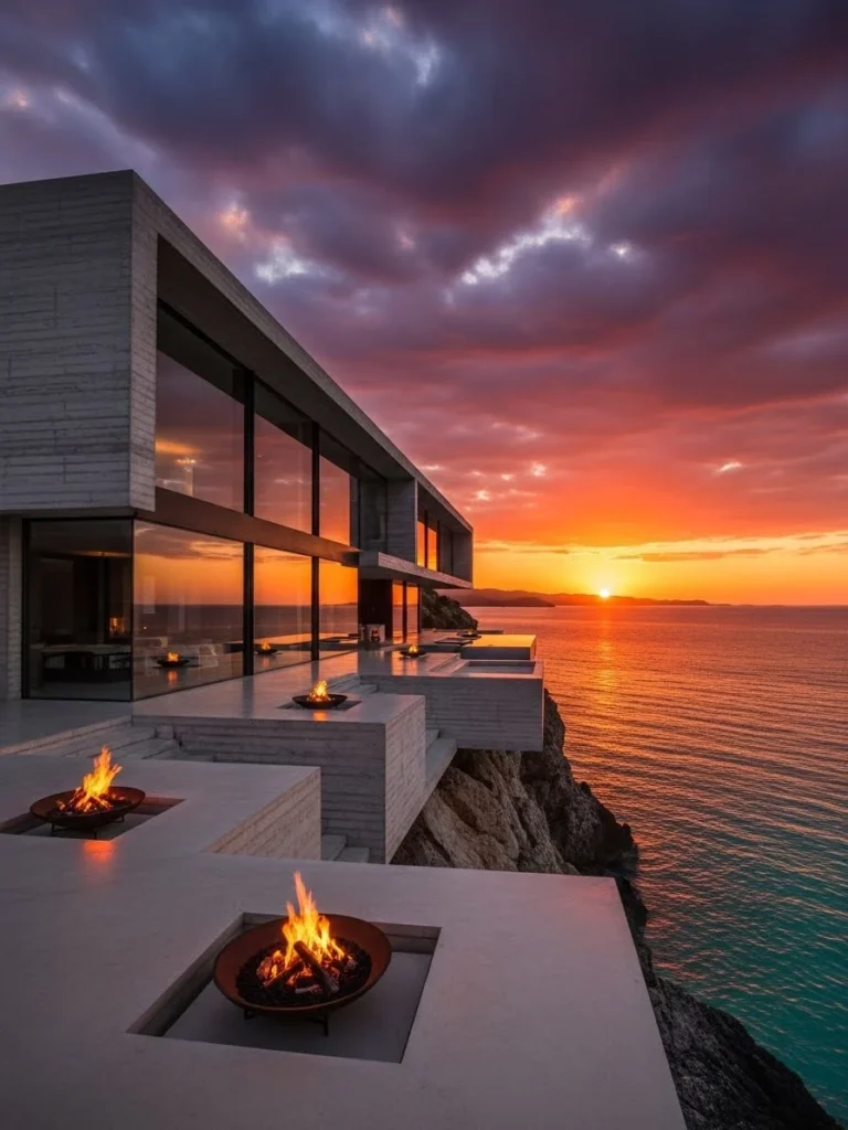 Outdoor fire pits are embedded directly into stone terraces, offering warmth against coastal winds. As the sun sets, the sky ignites in deep oranges and violets, reflected softly in polished surfaces. The architecture amplifies the moment without overpowering it.