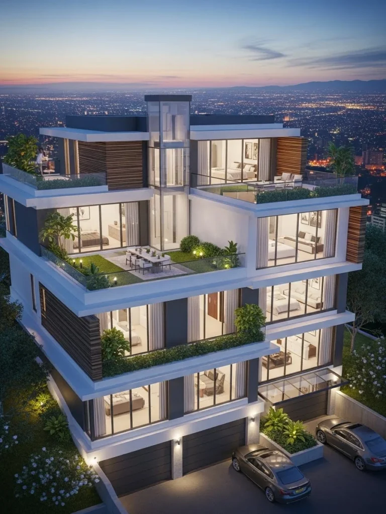 This modern mansion rises above the city, crowned with a lush rooftop garden that contrasts with sleek concrete and glass volumes. The design emphasizes horizontality, clean lines, and an effortless connection between natural greenery and urban sophistication.