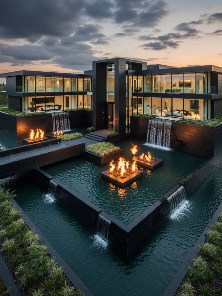At night, the mansion glows, fire and water interacting harmoniously with black stone. This residence is both a sanctuary and a spectacle, blending bold modern design with elemental luxury and dramatic visual storytelling.