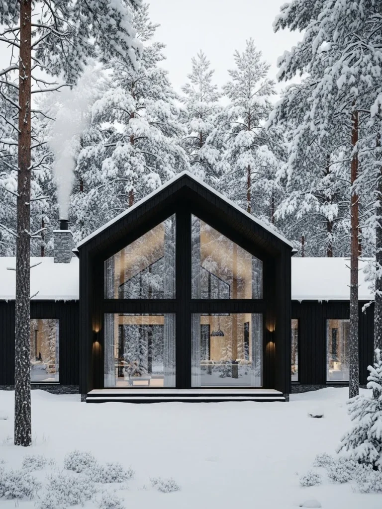 This luxury cabin reimagines Scandinavian design within a pristine pine forest. A blackened wood exterior contrasts sharply with snow-covered surroundings, creating a striking yet minimalist presence. The architecture feels modest in form yet rich in experience.
