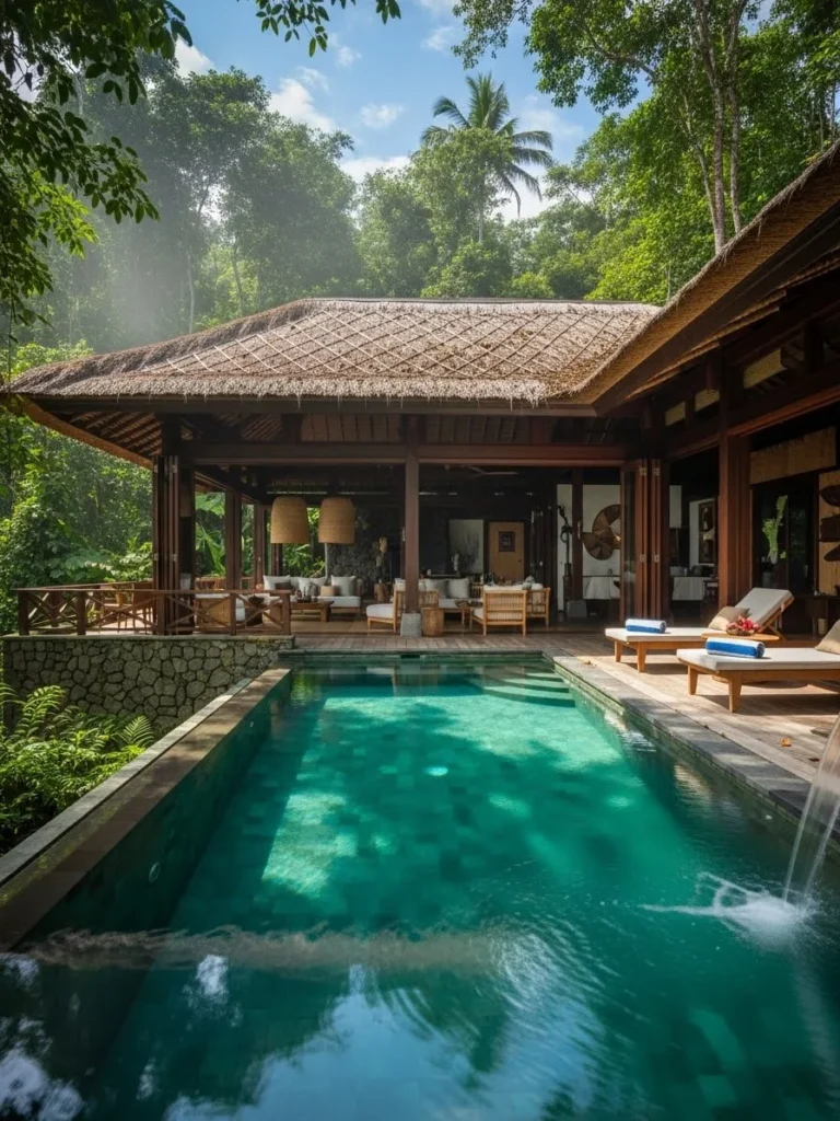 This tropical jungle villa is designed entirely around open-air living. Roofed pavilions replace enclosed rooms, allowing air, light, and greenery to flow freely through the space. The architecture feels relaxed yet intentionally refined.