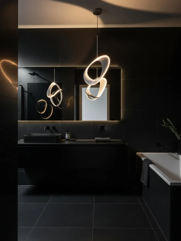 This black bathroom transforms lighting into a sculptural statement. Artistic pendant lights serve as functional art, introducing personality and drama into the space. The lighting immediately elevates the bathroom from simple to striking.