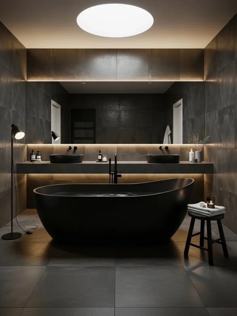This modern black bathroom is centered around a sculptural freestanding bathtub that commands attention. The tub’s bold form contrasts beautifully against textured black walls, creating a gallery-like focal point. It feels more like art than plumbing.