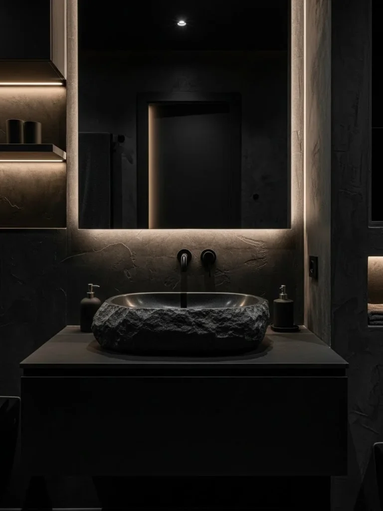 A stone basin sink adds organic texture, breaking up the dark surfaces with natural variation. Warm indirect lighting softens the mood, preventing the bathroom from feeling stark or cold.