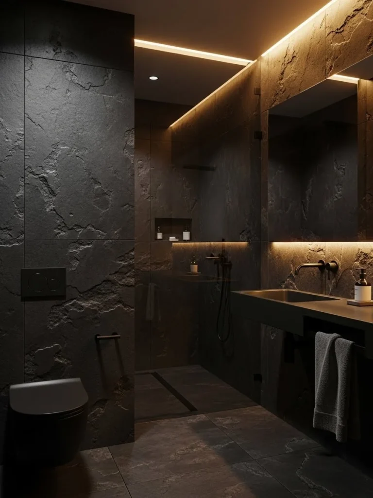 Ideal for luxury interiors, this bathroom proves that texture is key to making dark spaces feel inviting and refined.