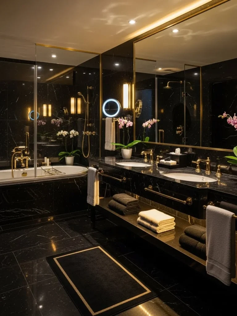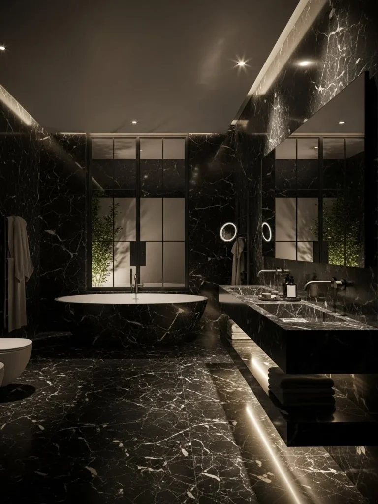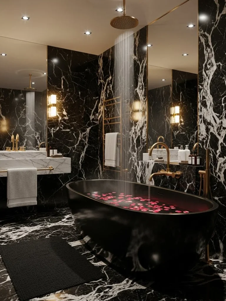 Warm ambient lighting softens the boldness of the black marble, casting a gentle glow that enhances the natural patterns in the stone. Gold or brass fixtures add a subtle touch of glamour without overpowering the spa-like atmosphere. Every detail feels intentional and indulgent.