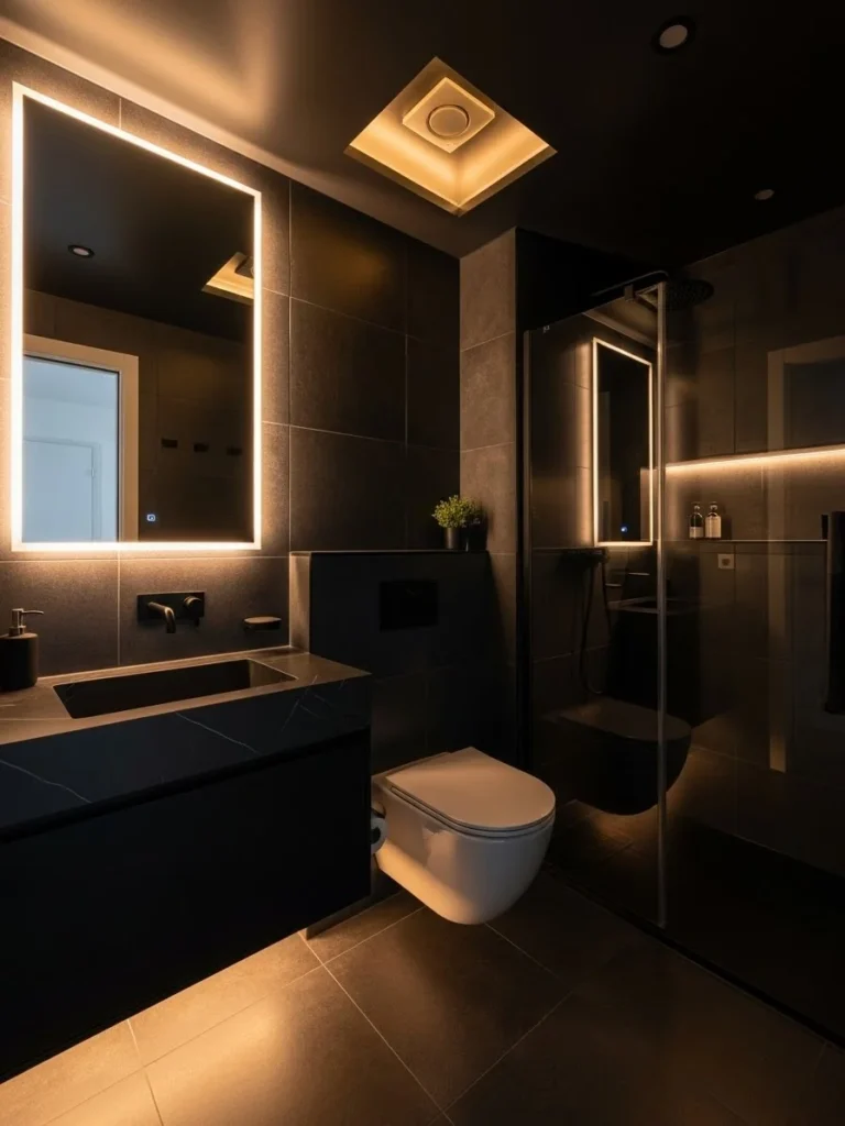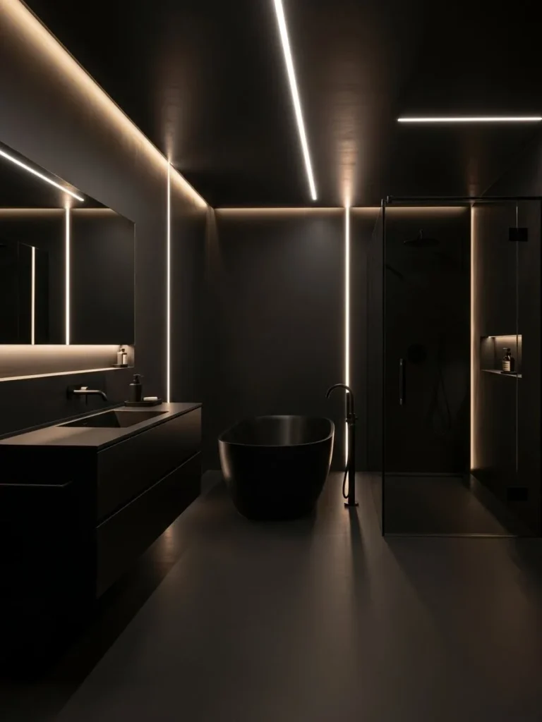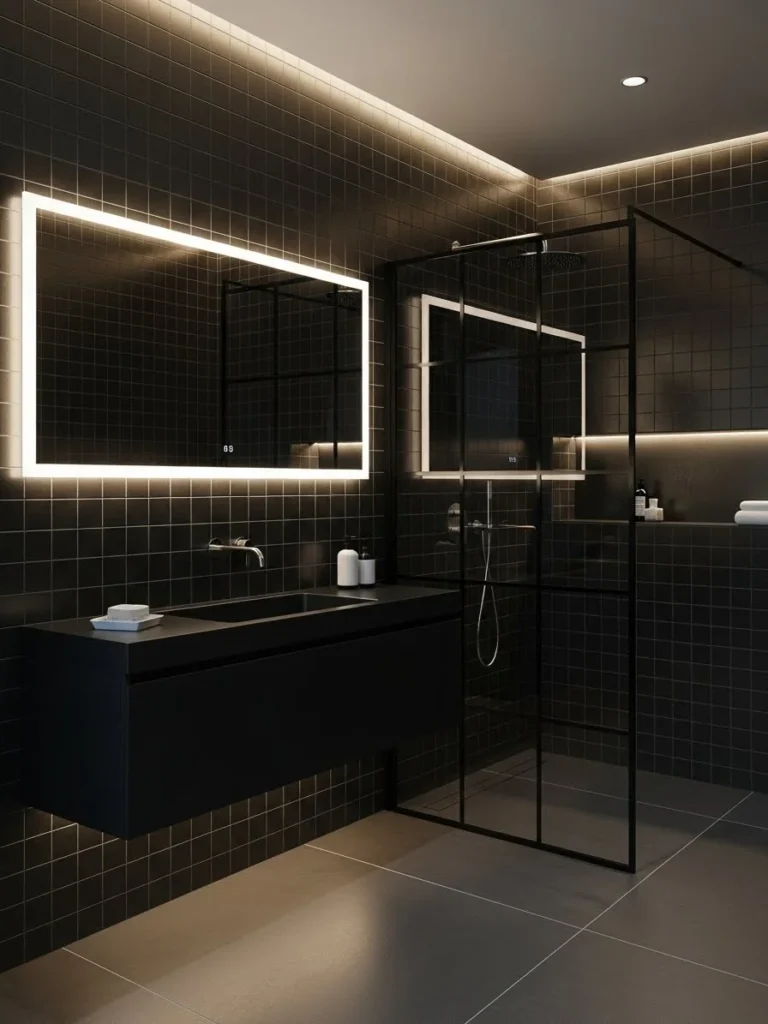 This contemporary black bathroom uses lighting as a defining design element. Matte black tiled surfaces create a sleek foundation, while integrated LED strips outline architectural lines and fixtures. The result is a space that feels modern, immersive, and visually dynamic.