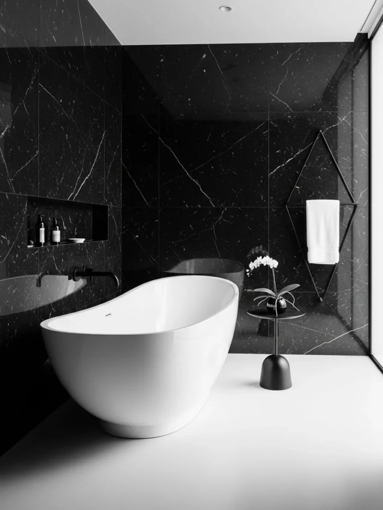 This high-contrast black and white bathroom delivers timeless elegance. Black marble walls create drama, while a sculptural white bathtub provides striking contrast. The interplay of light and dark feels balanced and sophisticated.