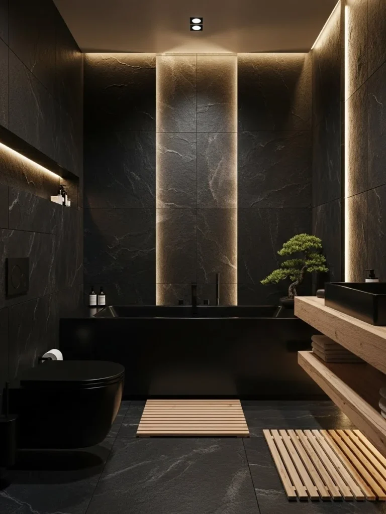 This Japanese-inspired black bathroom focuses on balance, simplicity, and quiet luxury. Black stone walls and floors create a grounding atmosphere that feels calm and intentional. The design avoids excess, allowing space, proportion, and material quality to define the experience. Every element feels purposeful and thoughtfully placed.