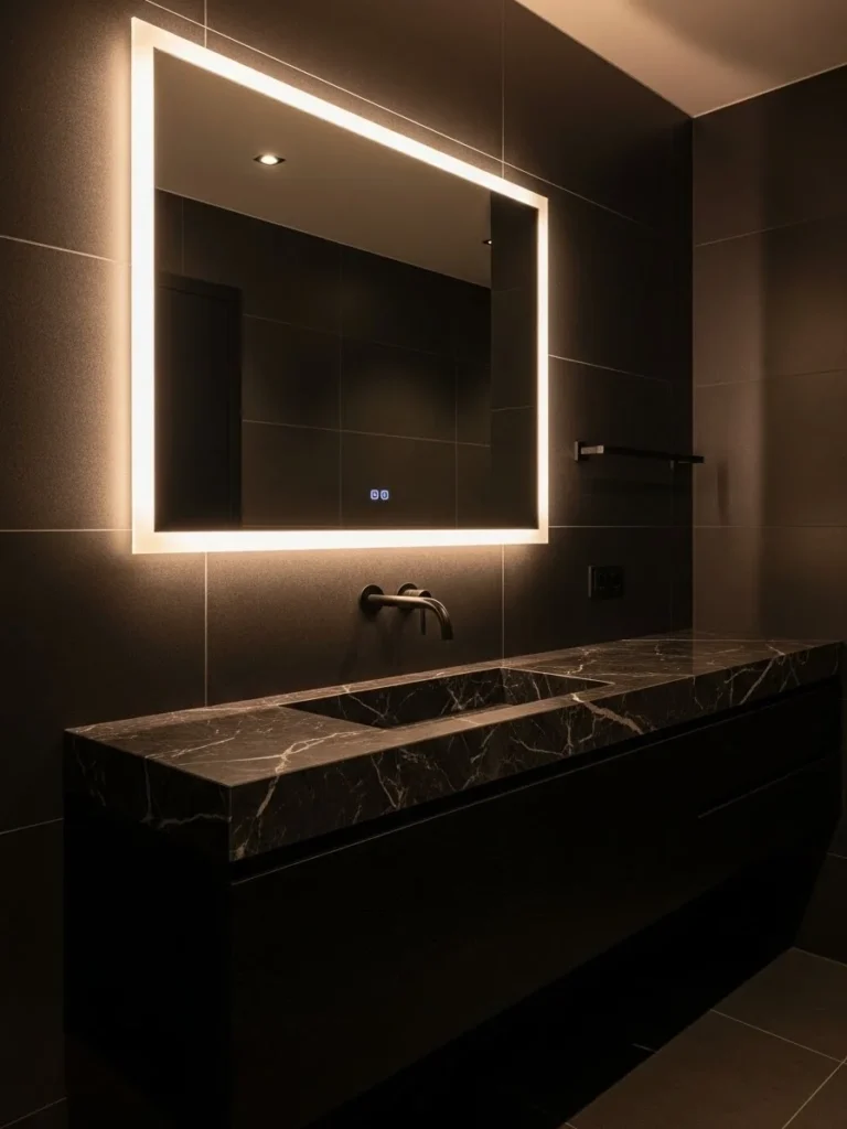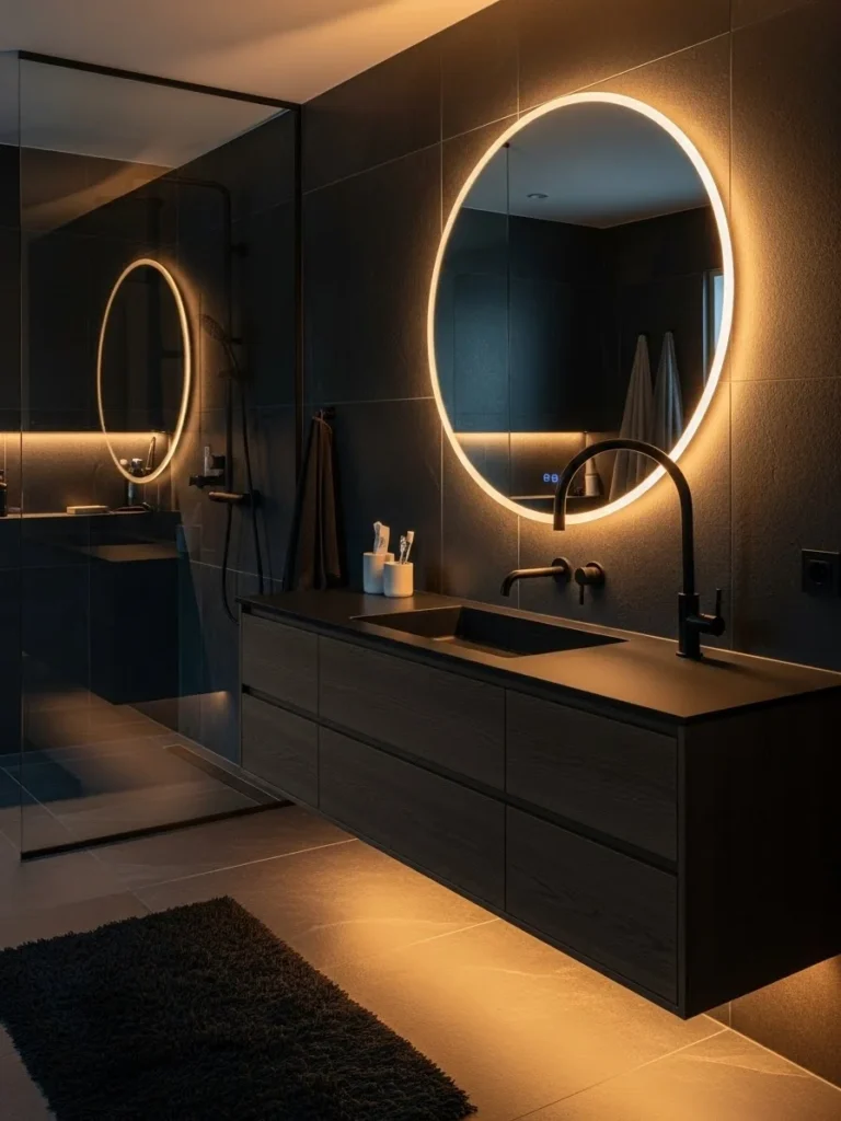 This luxury black bathroom centers around an oversized circular mirror that immediately draws attention. The LED-lit mirror adds softness and contrast to matte black walls, becoming both a functional and decorative feature. Its shape breaks up sharp lines, adding visual balance.