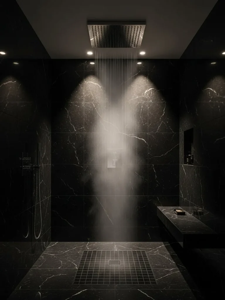 This luxury black bathroom is designed around a ceiling-mounted rain shower. The experience feels immersive and spa-like, encouraging relaxation and indulgence. Black marble walls enhance the sense of depth and drama.