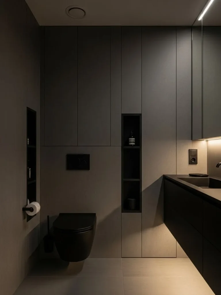 This moody black bathroom embraces darkness as a design feature rather than a limitation. Matte black walls and floors create a dramatic, enveloping atmosphere. The space feels intimate, sophisticated, and deeply modern.