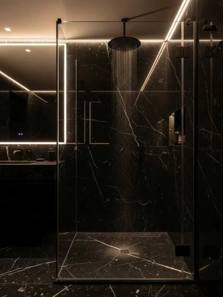 A ceiling-mounted rainfall showerhead enhances the spa-like experience. LED lighting strips highlight architectural lines and add a soft glow to the dark surfaces. The lighting creates depth without overpowering the design.