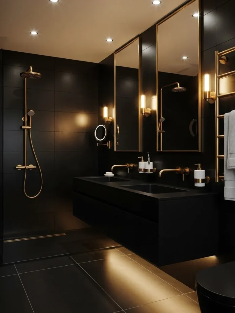 This modern black bathroom pairs bold darkness with warm metallic accents for a strikingly elegant look. Matte black tiles create a sleek foundation, while gold or brass fixtures introduce contrast and visual warmth. The combination feels luxurious without being flashy.