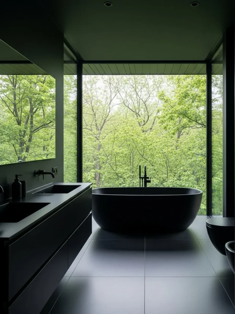 This modern black bathroom is elevated by floor-to-ceiling windows overlooking lush greenery. The matte black interior contrasts beautifully with the natural landscape, creating a serene and grounding atmosphere.