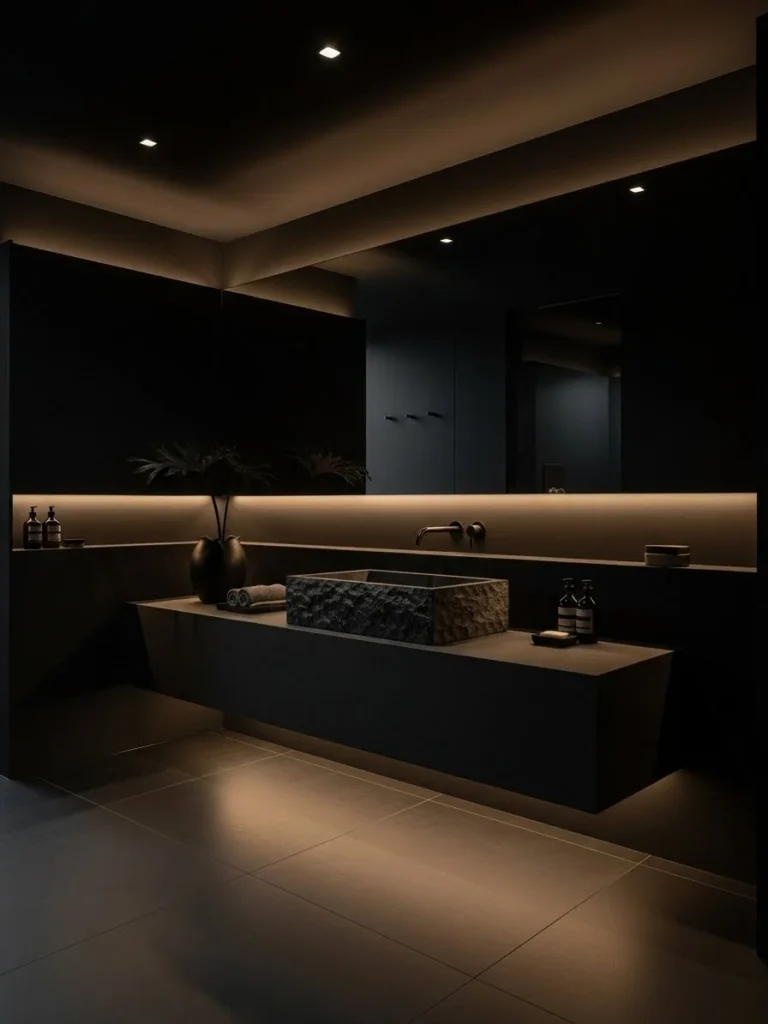 The hidden lighting adds depth and dimension, making the bathroom feel larger and more sculptural. Soft glows reflect subtly off black surfaces, preventing the room from feeling flat or overly dark. Every light source is intentional and carefully placed.