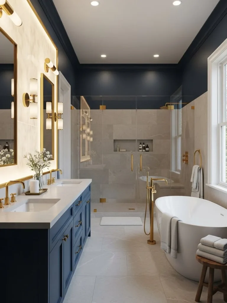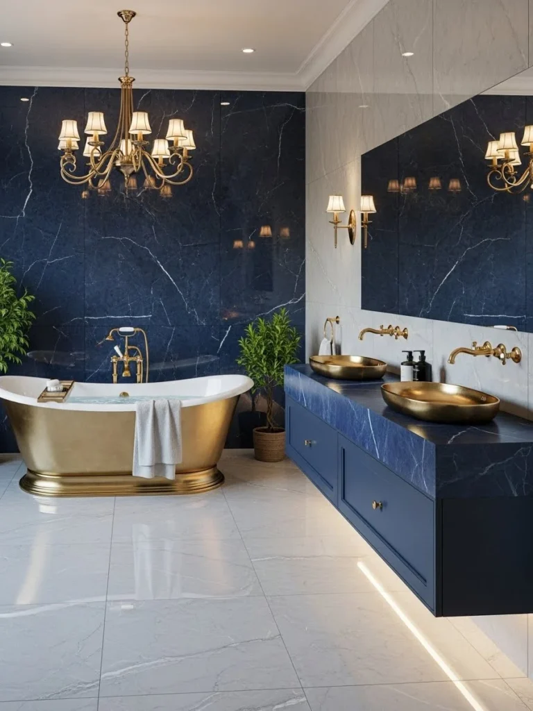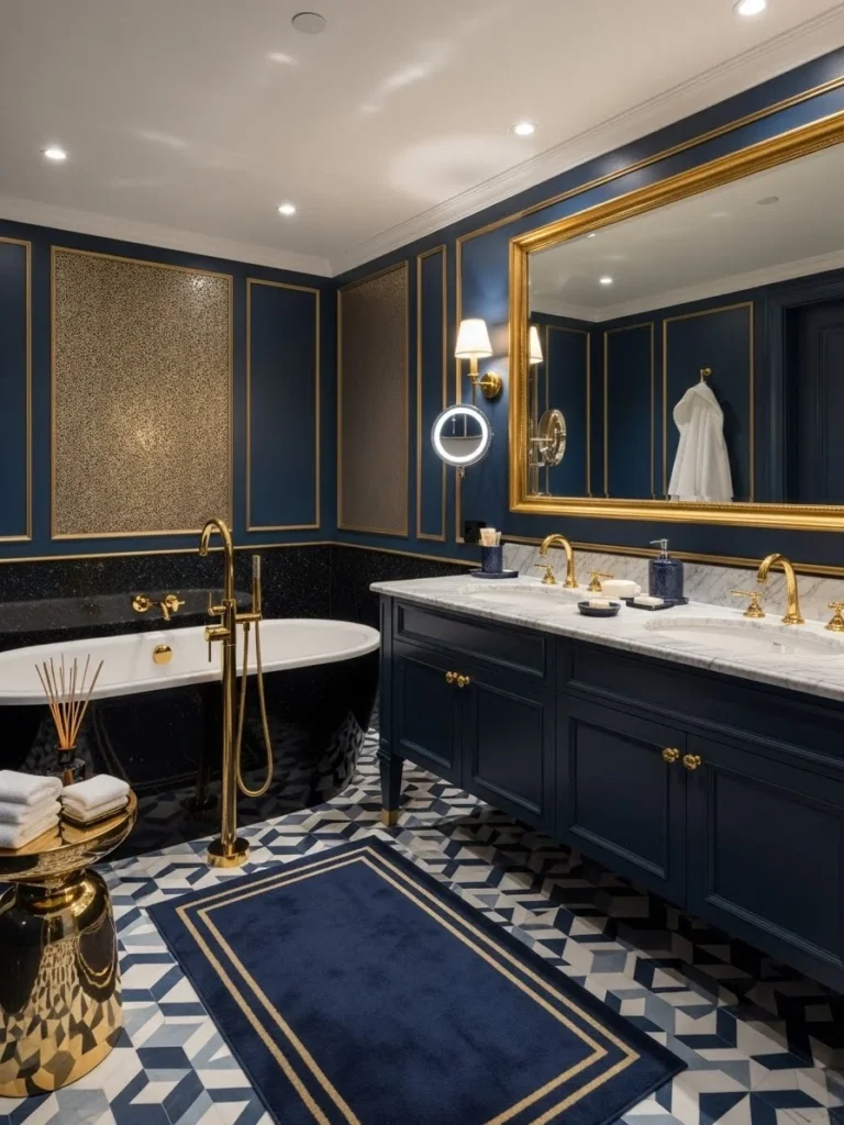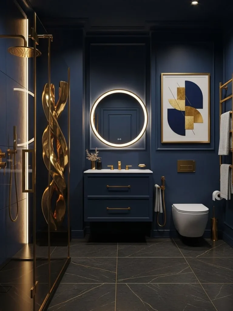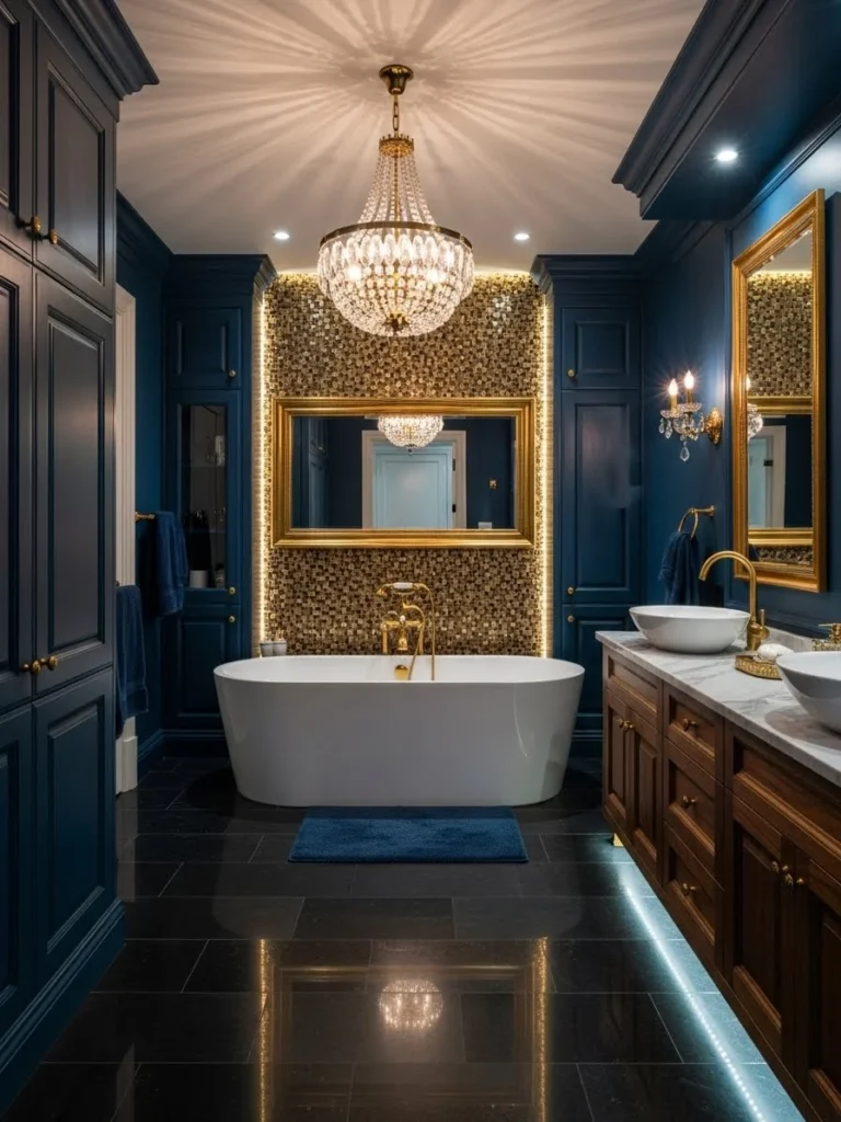 Soft, layered lighting brings out the richness of both navy and gold. The bathroom feels opulent yet modern, perfectly aligned with 2026 trends.