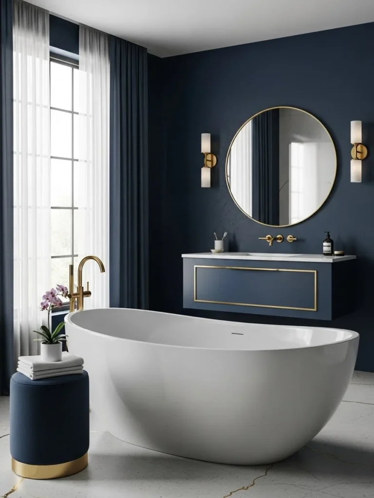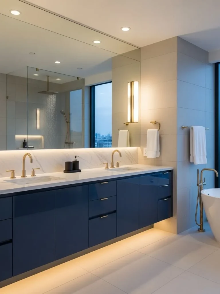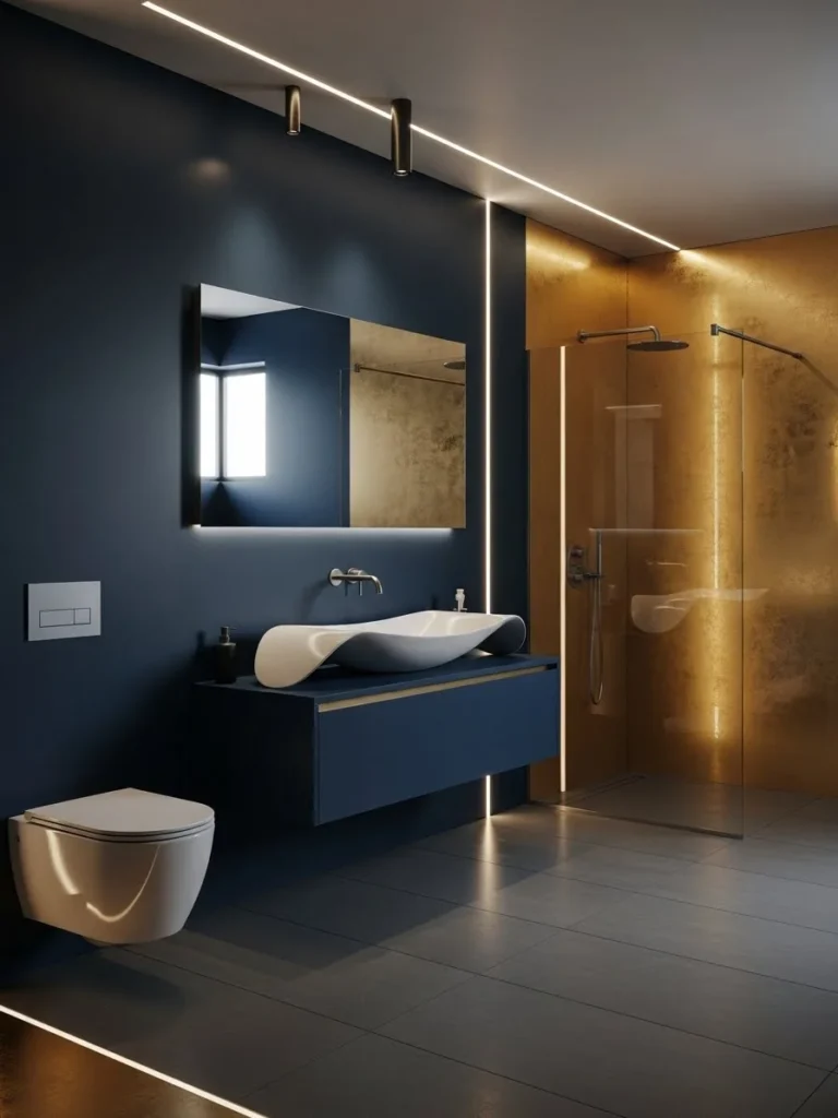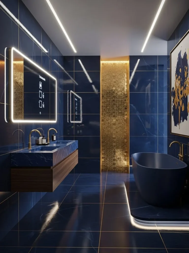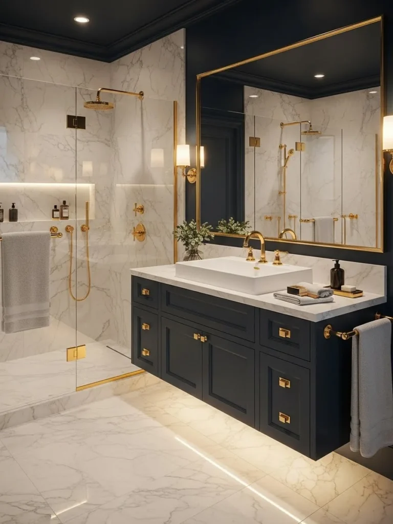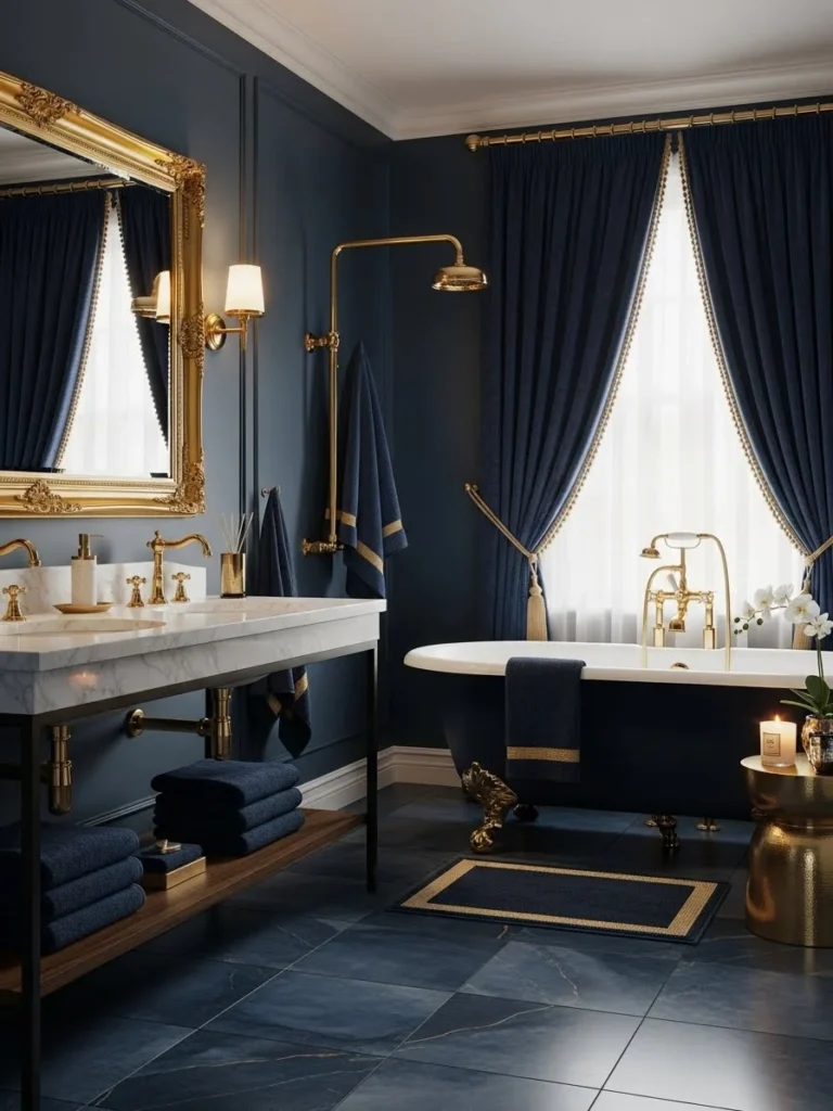 Soft, layered lighting brings out the richness of both navy and gold. The bathroom feels opulent yet modern, perfectly aligned with 2026 trends.