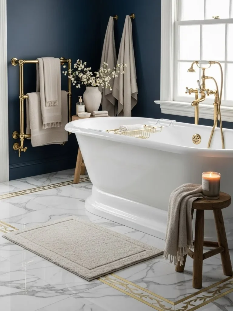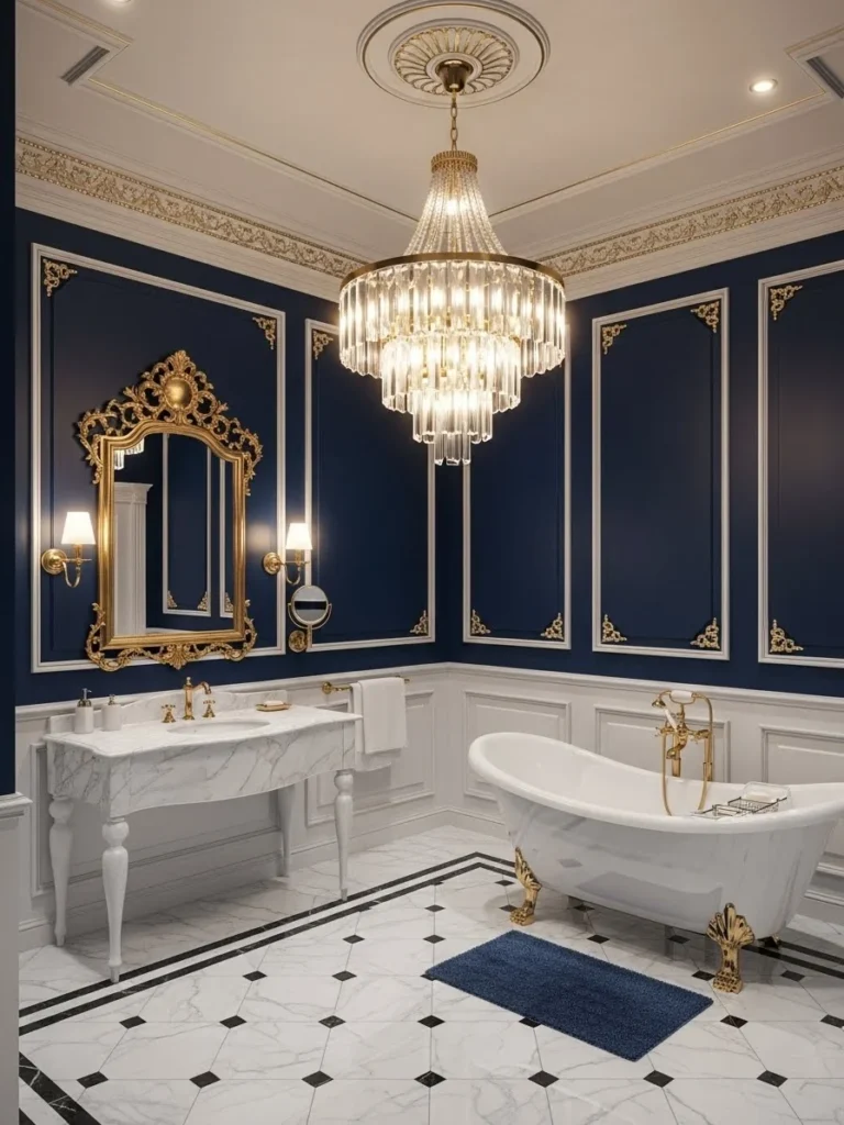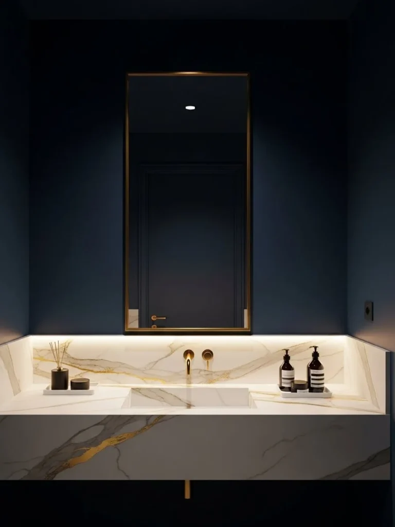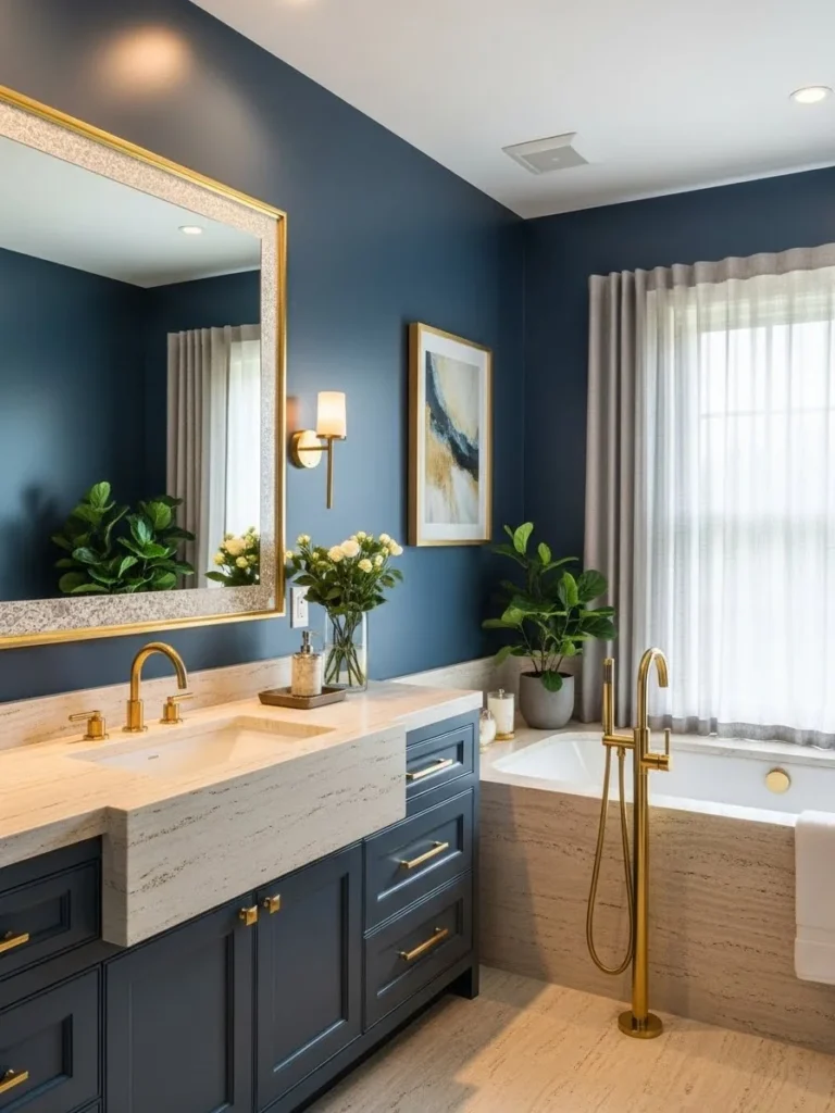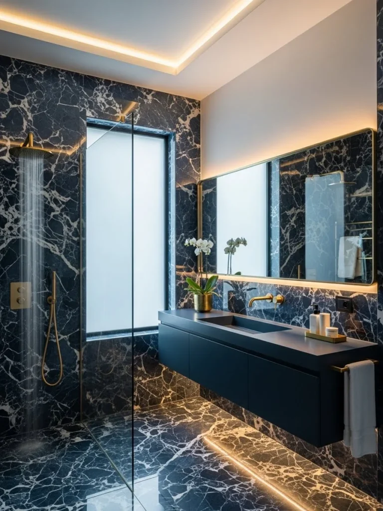 Soft, layered lighting brings out the richness of both navy and gold. The bathroom feels opulent yet modern, perfectly aligned with 2026 trends.