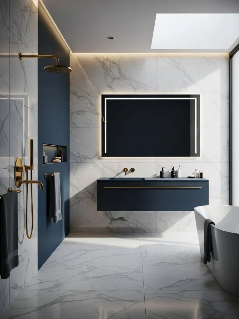 This modern bathroom highlights a navy wall accented with gold detailing as its focal point. The feature wall adds depth and architectural interest without overwhelming the space.