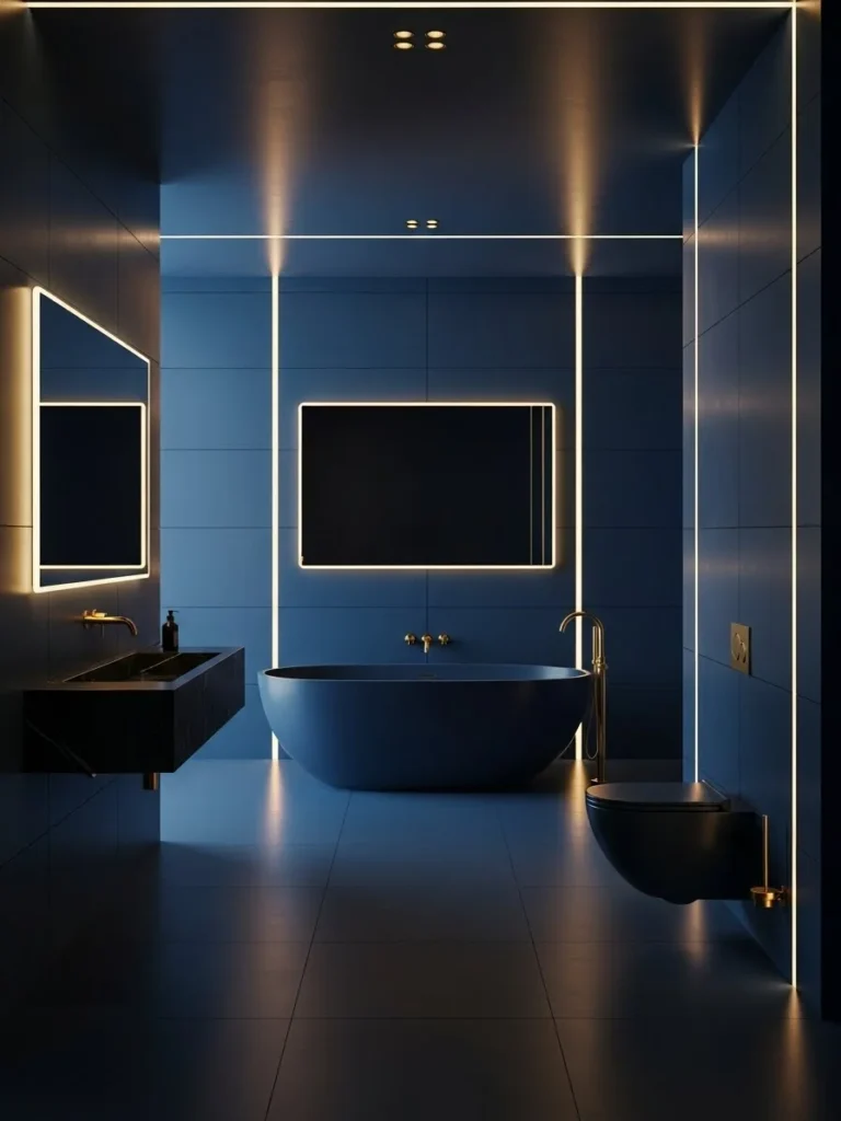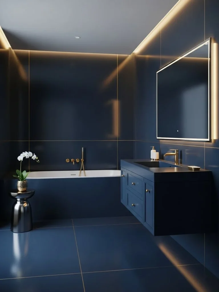 Gold accents appear through wall sconces and fixtures, adding warmth and elegance. Their subtle glow enhances the spa-like mood without disrupting the minimalist aesthetic. The balance between navy and gold feels refined and intentional.