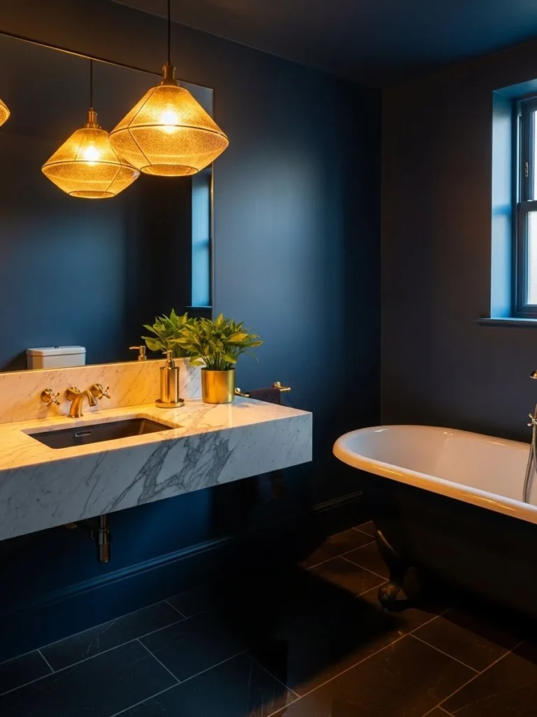 Deep navy walls anchor this high-contrast bathroom design. The bold backdrop allows sculptural fixtures and gold accents to shine.
