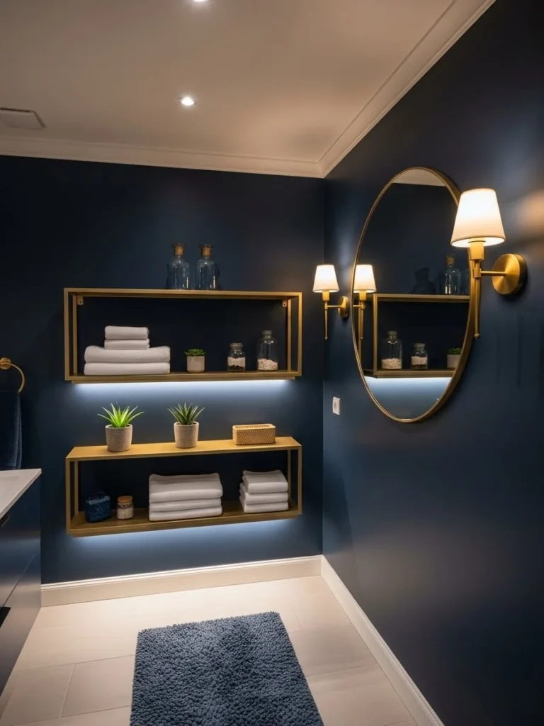 This bathroom uses navy cabinetry and walls paired with gold shelving accents. The shelving adds functionality while doubling as decorative detail.
