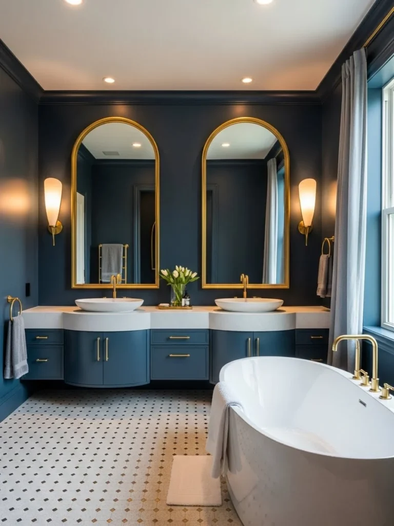 This bathroom features navy walls paired with elegant arch mirrors. The curved shapes soften the strong backdrop, introducing balance and visual interest.