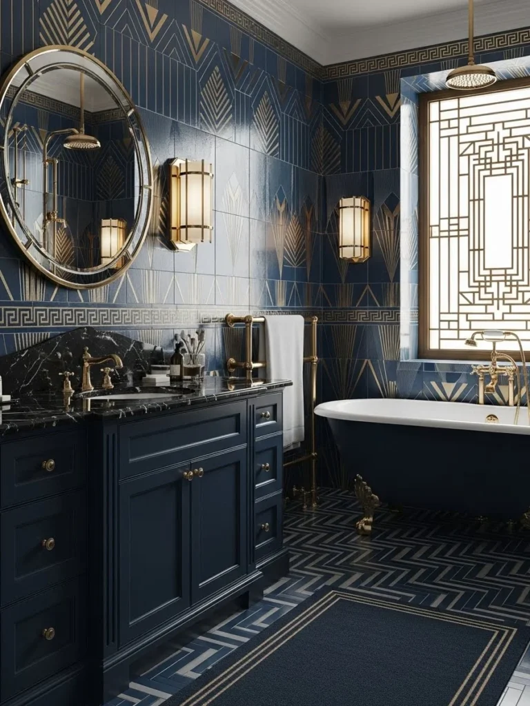 This bathroom draws inspiration from Art Deco elegance, blending navy blue tones with geometric precision. The color palette feels bold yet timeless, echoing classic luxury while remaining relevant for modern interiors. Structured patterns introduce rhythm and visual interest.