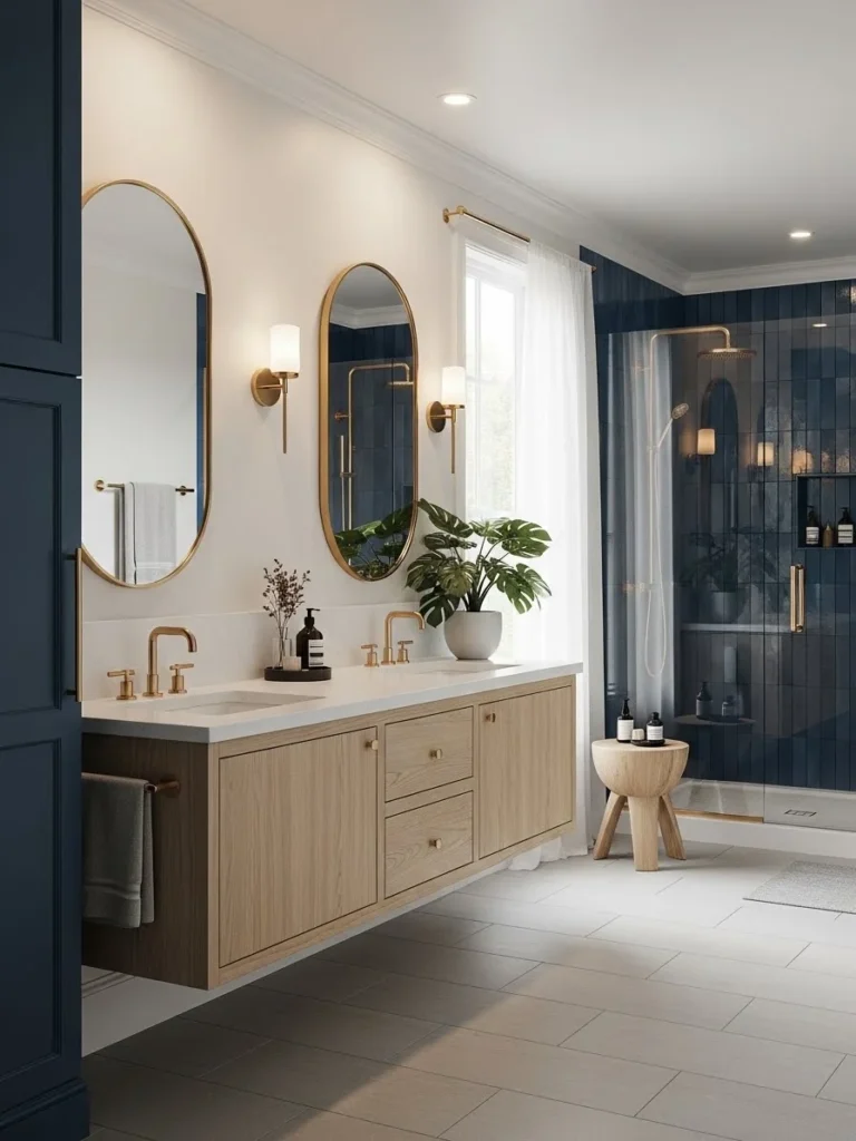 This contemporary bathroom combines navy cabinetry with champagne gold accents for a sophisticated palette. The contrast feels luxurious and balanced.