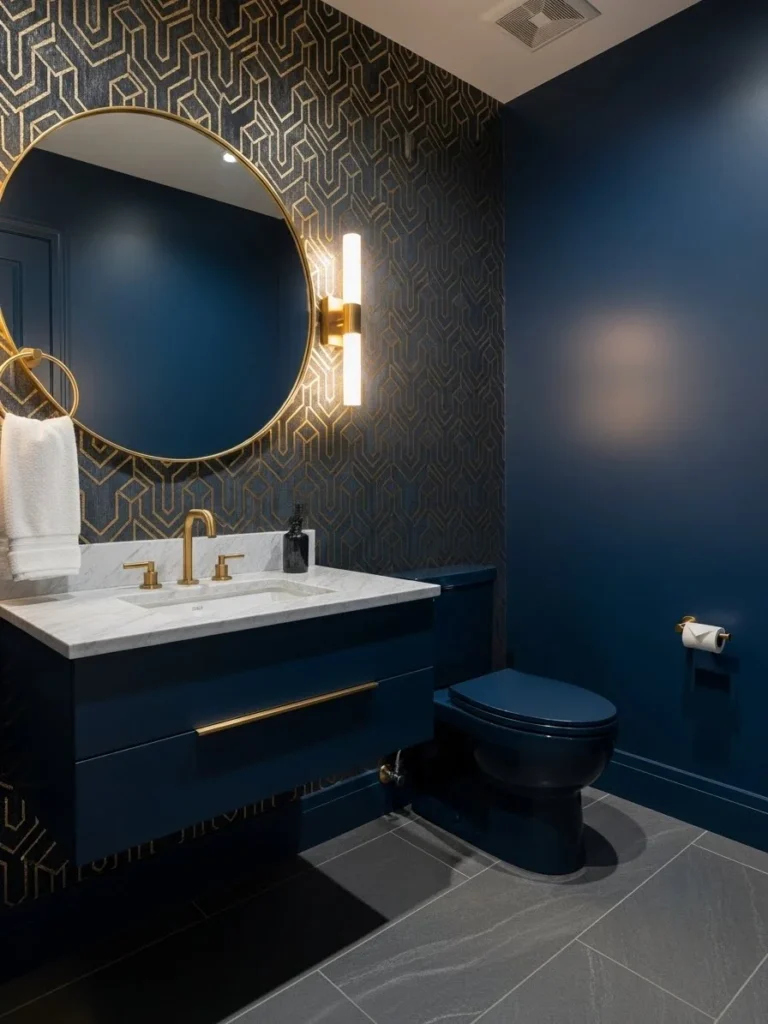 This powder room embraces navy blue with bold gold wallpaper accents. The contrast creates a glamorous, high-impact design.