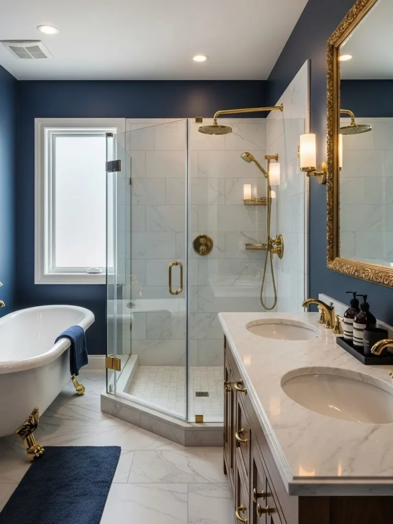 This bathroom features a navy accent wall paired with a gold-framed glass shower. The combination feels modern and luxurious, emphasizing transparency and openness.