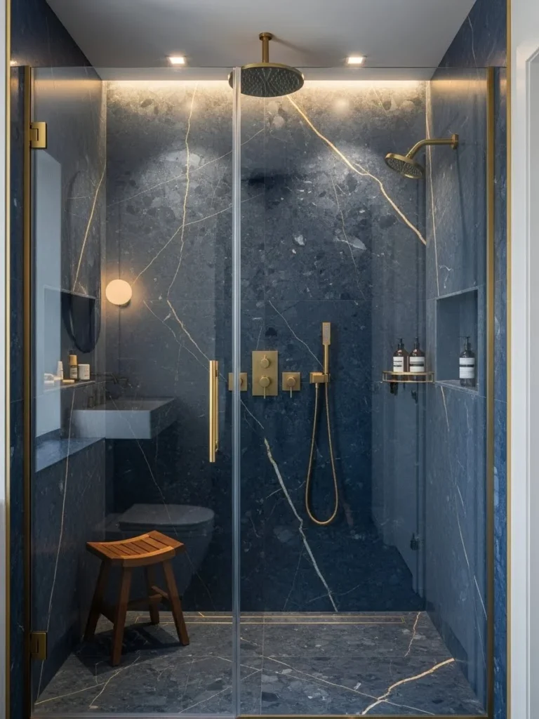 This bathroom showcases a navy marble shower as its defining feature. The rich stone creates a dramatic yet refined enclosure that elevates the daily shower into a luxury experience. Subtle veining adds movement and prevents the dark palette from feeling flat.