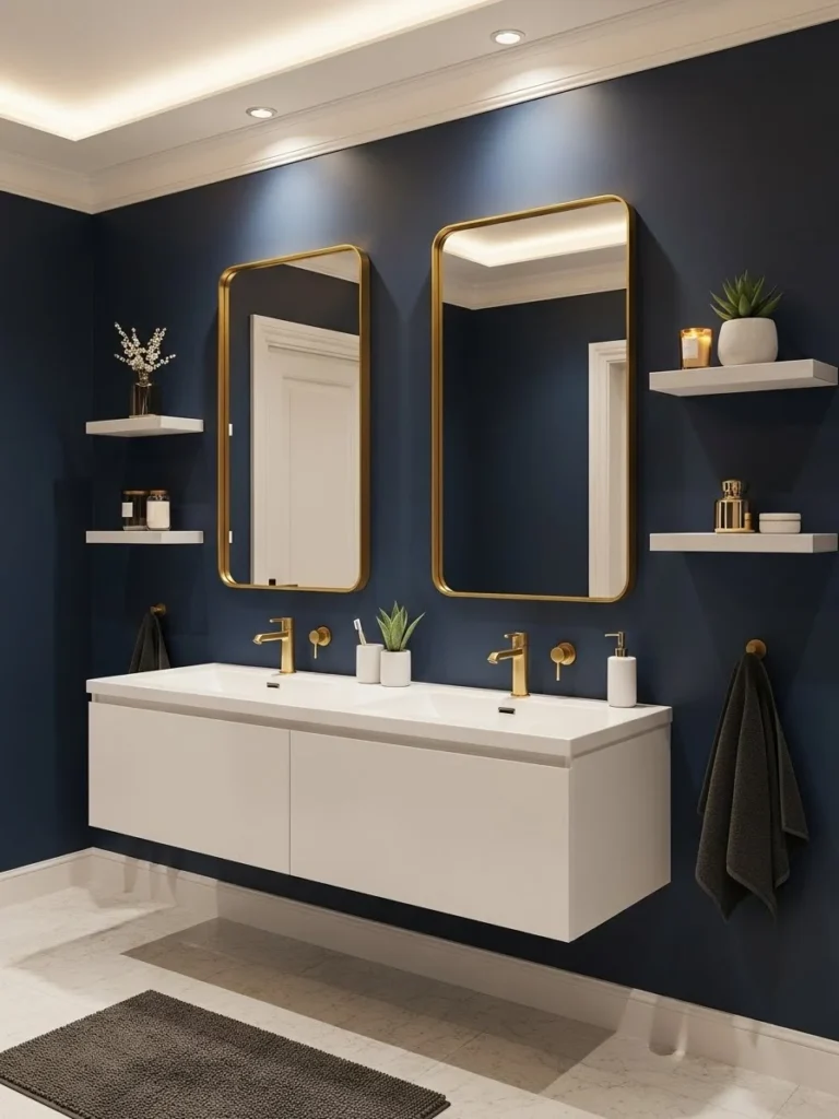 This bathroom uses navy blue walls as a refined backdrop for gold-framed mirrors. The deep color enhances reflection while adding dramatic depth to the space.