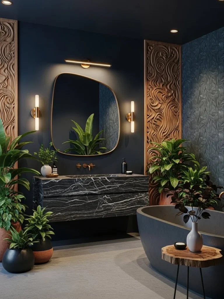 This organic luxury bathroom uses navy blue as a grounding element, paired with natural textures to create warmth. The color anchors the space while allowing softer materials to bring balance and comfort.