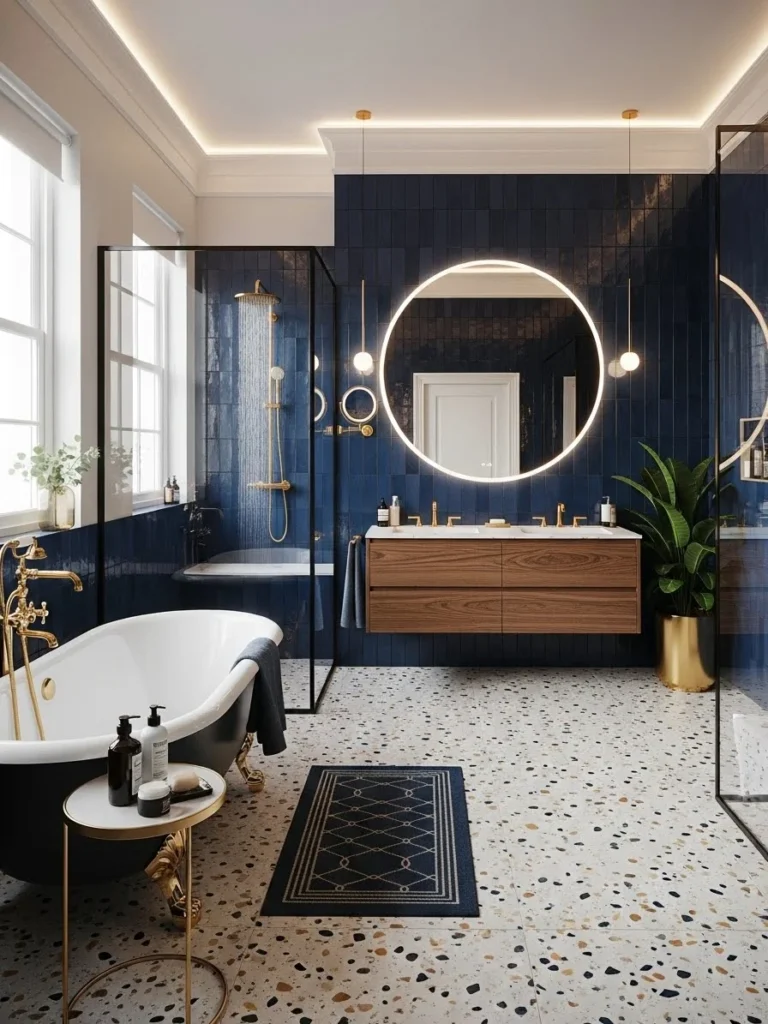 This luxury bathroom pairs navy tones with terrazzo flooring for a contemporary yet playful aesthetic. The terrazzo introduces texture and movement, softening the richness of the navy backdrop.