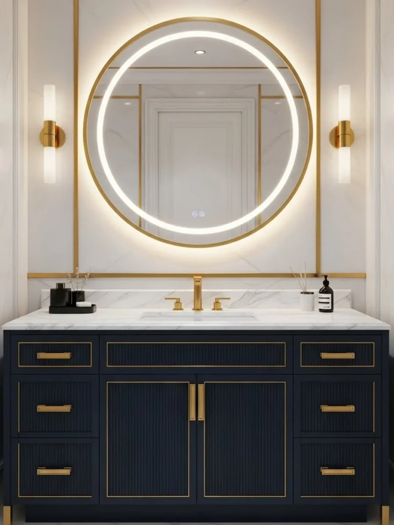A round backlit mirror adds softness to the composition. Its gentle illumination balances sharp lines, introducing harmony and visual flow. The mirror also enhances functionality while elevating aesthetics.