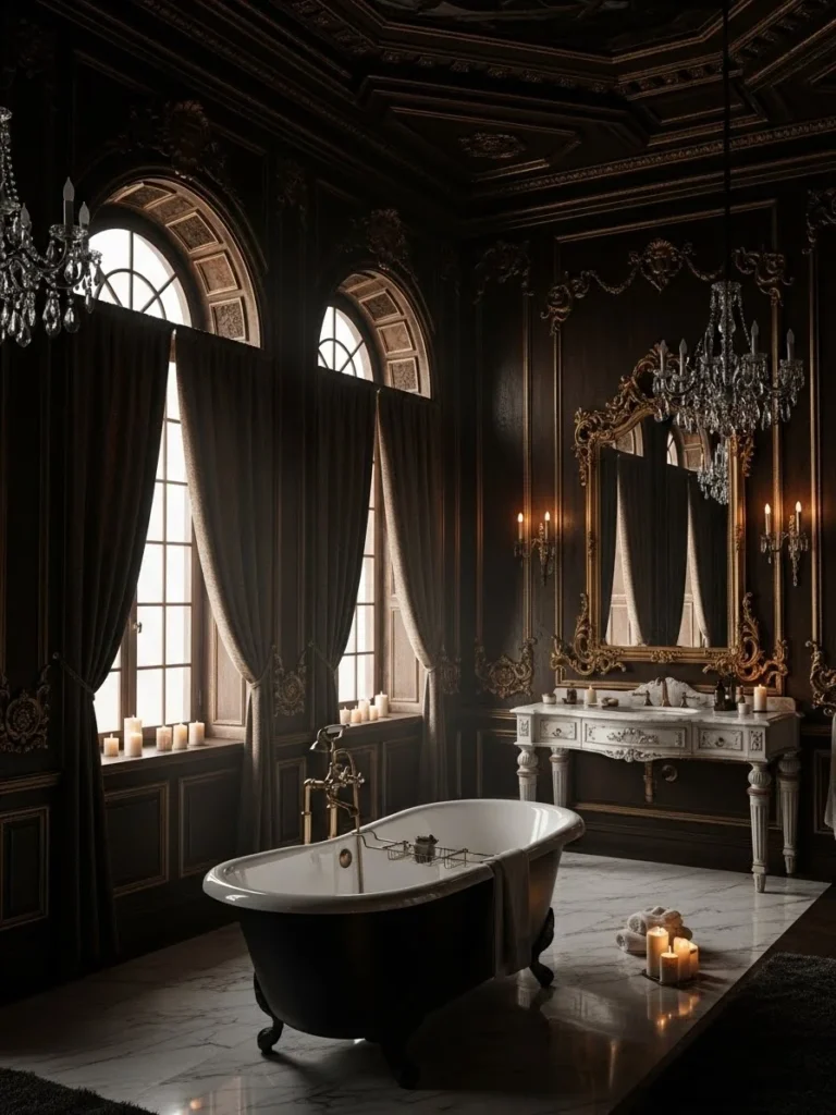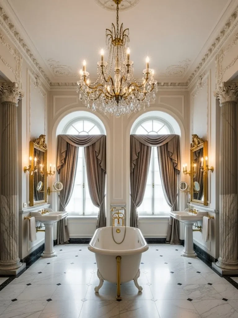 A freestanding bathtub occupies the central position beneath a classically inspired chandelier. The chandelier references historical metal and glass forms rather than modern crystal extravagance. Fixtures are identical on both sides, reinforcing symmetry.