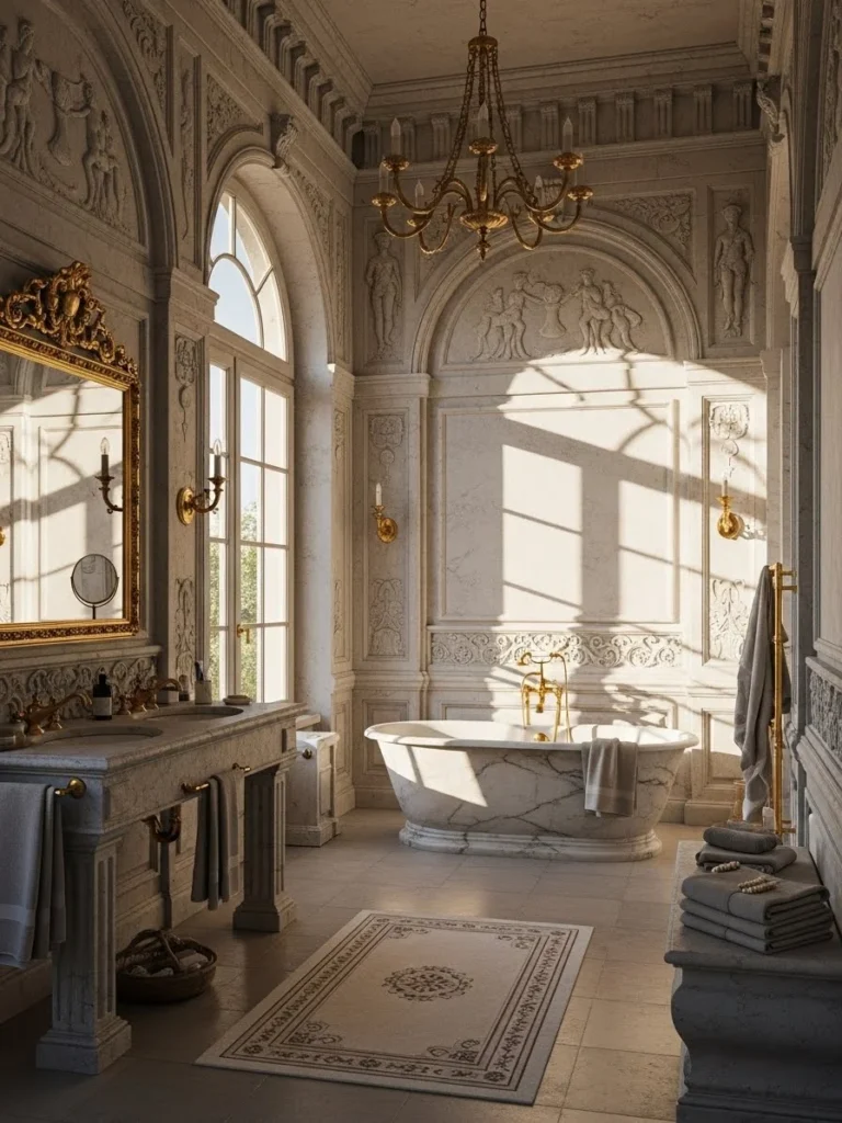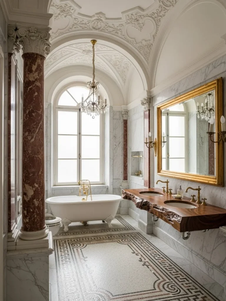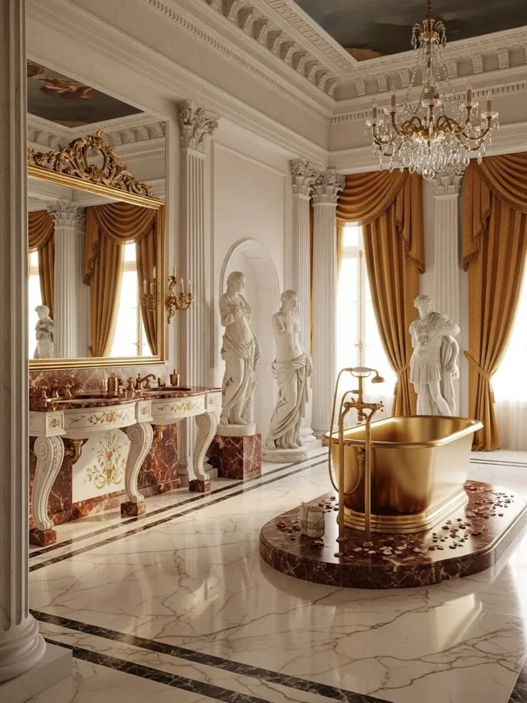 This bathroom reflects Baroque palatial interiors, where architecture was designed to impress through movement, depth, and controlled ornamentation. Curved surfaces, layered moldings, and dramatic cornices define the spatial character.