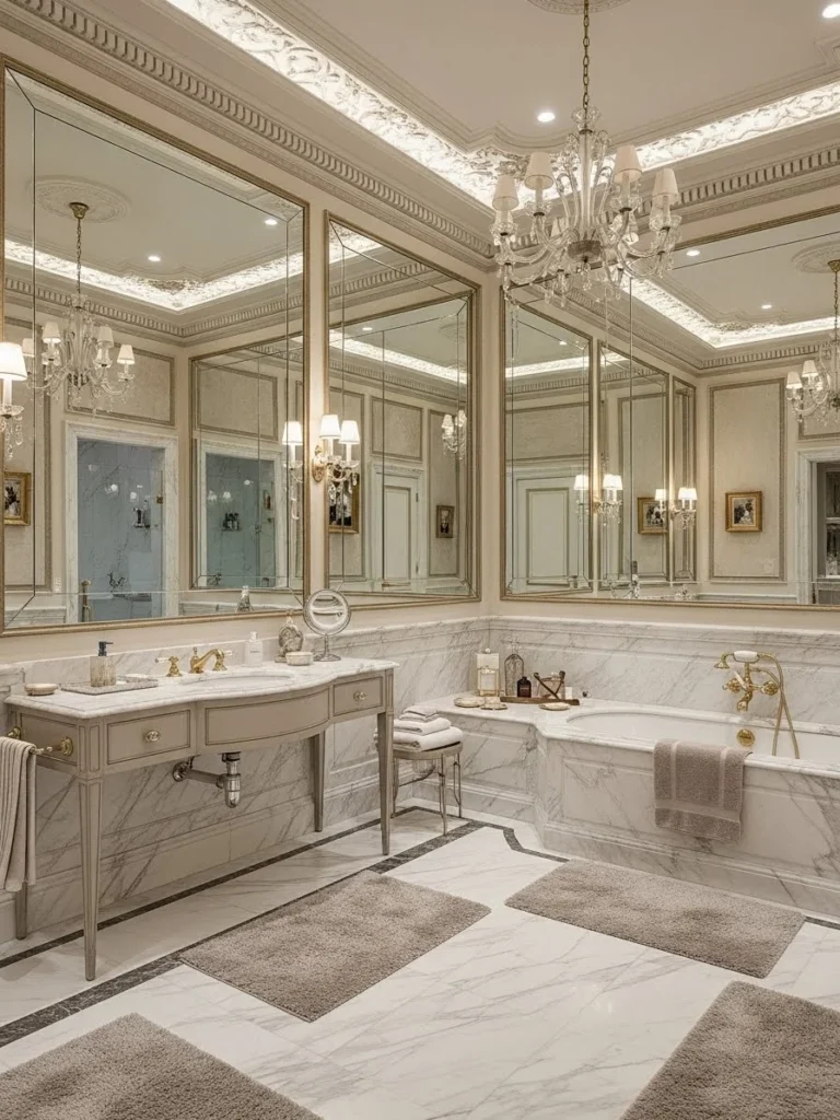 This bathroom is organized around a strong central axis, reflecting the palatial emphasis on order and ceremony. Symmetry governs all elements, from wall articulation to fixture placement, reinforcing visual balance and hierarchy.
