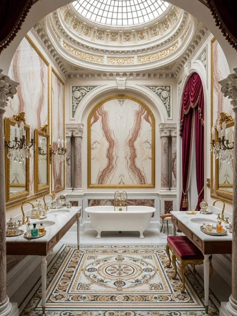 This bathroom centers on a domed ceiling, a form historically associated with sacred and civic architecture adapted for palatial interiors. The dome establishes vertical hierarchy and spatial focus, drawing the eye upward and reinforcing monumentality within a private setting.